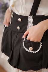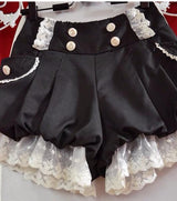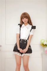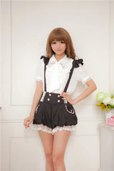 - An ultra kawaii pair of black & white bloomer style shorts with suspenders attached that criss cross in the back.