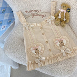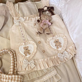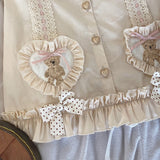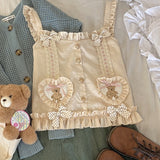 - The heart buttons and ruffled tank top sleeves add a feminine touch, while the cute teddy bears in hearts give it a playful, kawaii feel.