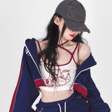 • Jacket: A cropped zip-up jacket in navy blue with maroon accents, featuring a sporty design and elastic cuffs for a relaxed, trendy look.